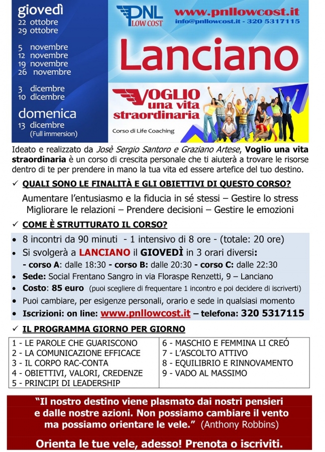 Aperte le iscrizioni online a “Voglio una vita straordinaria” il corso di Life Coaching per migliorare la propria vita e le proprie relazioni. (leggi programma)