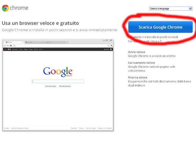 Per chi non lo avesse installato, può scaricarlo gratuitamente da questo link: scarica Google Chrome, cliccando in alto a destra sul pulsante azzurro Scarica Google Chrome e seguendo la procedura di installazione, durante la quale si consiglia di impostare sul computer Google Chrome come browser predefinito.