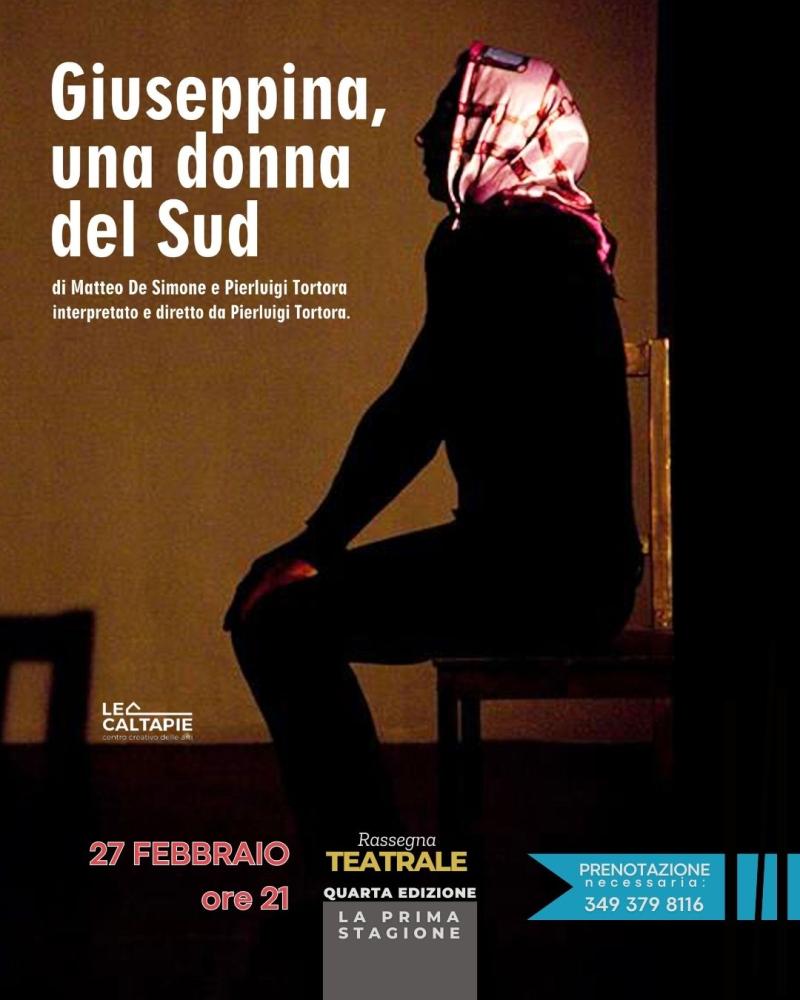 A grande richiesta, il primo spettacolo si intitola “Giuseppina, una donna del Sud” del Maestro Pierluigi Tortora, di origine casertana, caratterizza il suo lavoro tra sperimentazione e tradizione. Nei panni di Giuseppina, Tortora intreccia racconti, ricordi, storie di uomini e donne stupiti e innamorati della vita.