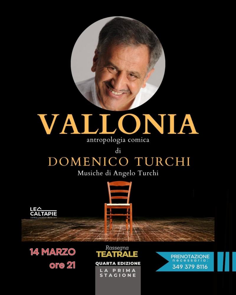 Dalla penna ironica e autobiografica il monologo comico antropologico del nostrano Domenico Turchi in “Vallonia”, con il brillante commento musicale del Maestro Angelo Turchi. Un duo familiare che ha tanto da raccontare con leggerezza e garbo, tipici della comicità di Turchi.
