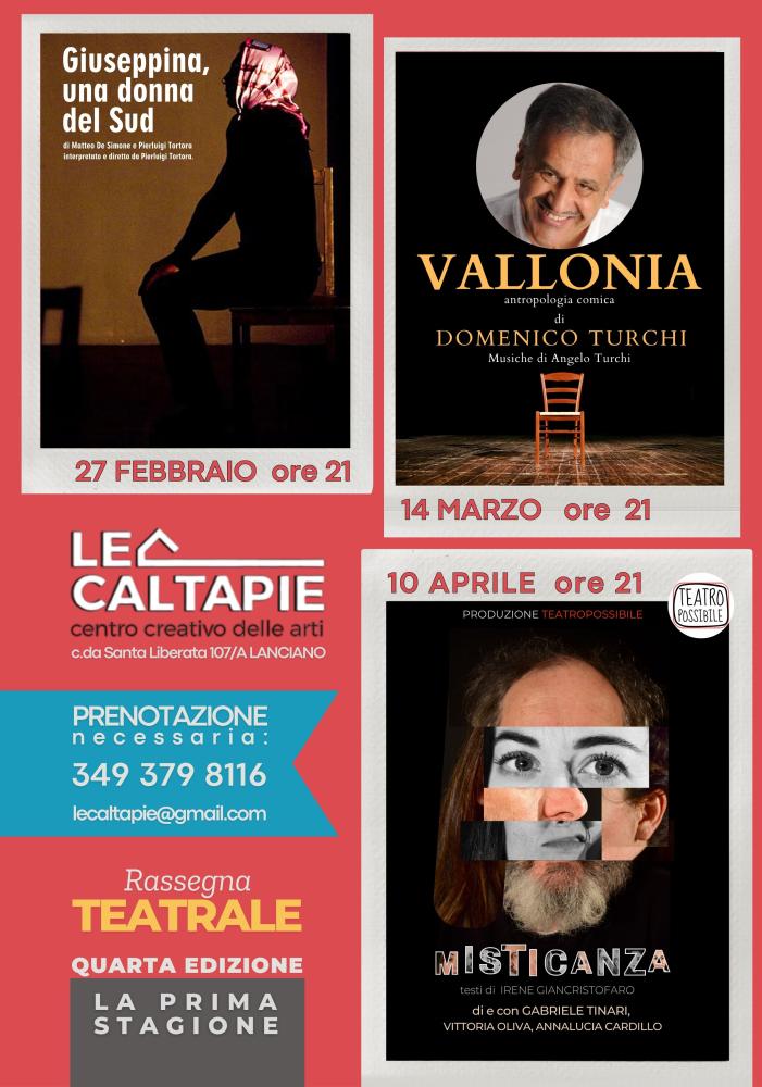 Per concludere con l’ultima produzione del Teatro Possibile intitolata “MISTICANZA”, tre donne, tre racconti, un elemento: l’Acqua. Un lavoro di sinergia con la scrittrice e poetessa Irene Giancristofaro, autrice dei testi delle tre narrazioni biografie riadattate da Gabriele Tinari, Vittoria Oliva e Annalucia Cardillo, voci e corpo della messa in scena.