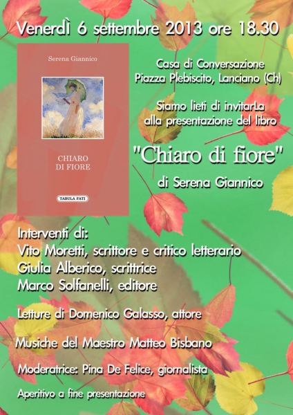 Lanciano (Ch), 30 agosto 2013 - Esce in libreria "Chiaro di fiore", la terza raccolta di poesie della giornalista frentana Serena Giannico, pubblicata per i tipi di Tabula Fati (pagg. 72, 8,00 euro). Il volume sarà presentato venerdì 6 settembre 2013 a Lanciano, presso la Casa di Conversazione in piazza Plebiscito alle 18.30, in una serata-evento tra letture e musica, con la partecipazione dell'autrice e di Vito Moretti, scrittore e critico letterario nonché autore della presentazione della raccolta, Giulia Alberico, scrittrice, e l'editore Marco Solfanelli. L'attore Domenico Galasso leggerà alcune poesie, sulle note del maestro Matteo Bisbano. L'incontro sarà presentato dalla giornalista Pina De Felice, e si concluderà con un aperitivo.