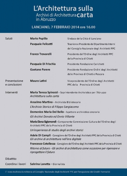 E' visitabile presso il polo Museale Santo Spirito, promossa dall’Ordine degli Architetti, Pianificatori, Paesaggisti, Conservatori della Provincia di Chieti, in collaborazione con la Sovrintendenza Archivistica per l’Abruzzo, con il patrocinio del Consiglio Nazionale degli Architetti PPC e del Comune di Lanciano, ed il sostegno della Fondazione CariChieti e della Fondazione degli Ordini degli Architetti PPC delle Province di Chieti e Pescara, la mostra documentaria, a cura della Soprintendenza archivistica per l'Abruzzo, ARCHITETTURA SULLA CARTA- Gli archivi di architettura in Abruzzo , primo momento di valorizzazione di un decennio di ricerca e censimento degli archivi di ingegneri e architetti contemporanei presenti sul territorio regionale. La rilevazione degli archivi è stata condotta in adesione al progetto “Piano nazionale per gli archivi dell’architettura del Novecento” promosso dal Ministero per i Beni e le Attività Culturali ed ha portato alla individuazione di 23 archivi. Questi archivi grazie alla dichiarazione di interesse culturale entrano a far parte della memoria collettiva accessibile alle istituzioni, agli studiosi, ai tecnici e in genere al pubblico interessato. Lanciano è presente con gli Archivi dell'Ing, Filippo Sargiacomo, di Donato Villante e dell'Arch. Ennio Villante. La mostra consente di avere un quadro abbastanza rappresentativo della produzione progettuale in Abruzzo dalla metà dell’800 a tutto il secolo scorso. I disegni e i grafici che qui si mostrano per la prima volta rappresentano la documentazione attraverso la quale sarà possibile scrivere la storia dell’architettura e dell’urbanistica in chiave regionale. Per avere una idea del senso dell’abitare, della modificazione della relazione con l’ambiente-territorio che è luogo dove le relazioni umane si formano, gli archivi giocano un ruolo fondamentale perché in essi ritroviamo sia i ‘sogni’ che le ‘realizzazioni’, sia il progetto che il manufatto, anche di pregio, ma mimetizzato all’interno di una struttura urbana a volte banale. Ne risulta un’idea di architettura non solo realizzata ma a volte solo proposta o anche solo immaginata. Schizzi di studio, progetti esecutivi, modelli e foto di cantiere ma anche documenti contabili sono importanti non solo sul versante della ricerca scientifica ma anche nella pratica di restauro e nella progettazione futura, servono a intravvedere un destino migliore per i nostri territori. All’obiettivo della salvaguardia e conservazione di questo importante patrimonio si aggiunge la questione rilevante della sua fruizione che deve consentire una veloce ed agile consultazione dei dati raccolti. A questo scopo la Soprintendenza ha realizzato, contestualmente alla mostra, una guida agli archivi di architettura abruzzesi dallo stesso titolo. Scorrendo la guida emergono personalità e professionalità di portata nazionale eppure misconosciute, o addirittura dimenticate, che dall’architettura alla urbanistica, dagli impianti industriali alle infrastrutture hanno modificato con il loro lavoro il volto dell’Abruzzo, soprattutto in alcune zone. La guida si presenta come un ‘work in progress’ perché ci si auspica che questa occasione di incontro sia un invito a segnalare e a facilitare l’individuazione di altri archivi, e quindi il loro studio; per la Soprintendenza è un invito a raccogliere ulteriori dati e notizie allo scopo di integrare il corpus documentario fin qui raccolto. La guida è diffusa gratuitamente dalla Soprintendenza, dietro motivata richiesta scritta.Per il 7 Febbraio è prevista una interessante giornata di studi con importanti interventi di esperti del settore.