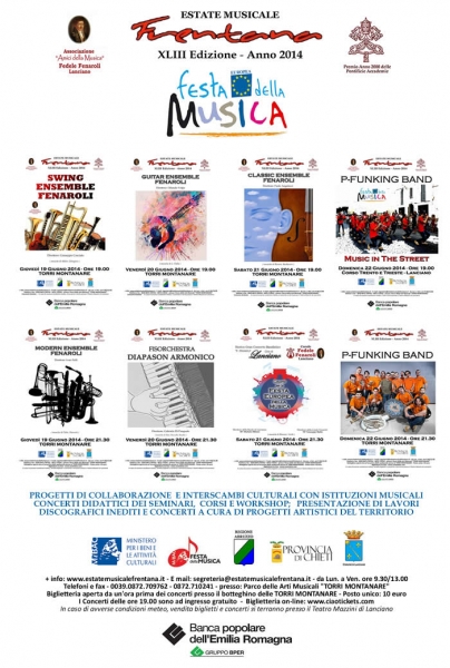 A Lanciano, nell'ambito dell'Estate Musicale Frentana 2014, sarà finalizzata ad una 4 giorni musicale, con la programmazione di 2 eventi concertistici al giorno, alle 19.00 (ingresso gratuito) e alle 21.30, (posto unico 10 euro) presso il Parco delle Arti Musicali e la piazza d'armi delle “TORRI MONTANARE” e un live di anteprima presso il corso principale della città, tutti legati ai seminari ai workshop e alle attività didattiche svolte nella struttura nei giorni antecedenti i concerti, prodotti in relazione alle collaborazioni artistiche instaurate con enti didattici e progetti musicali del territorio, collegati alla formazione musicale, alla promozione di progetti artistici, composizioni e produzioni discografiche inedite.