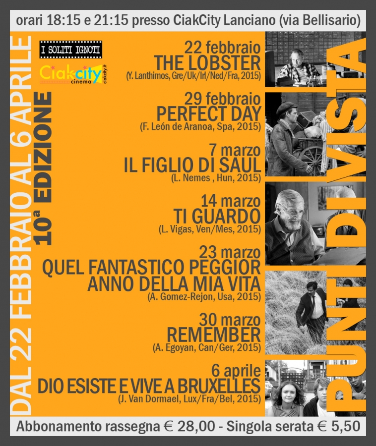 Il cinema visionario e stralunato del regista e sceneggiatore greco Yorgos Lanthimos aprirà la rassegna con un dramma tinto di fantascienza e ricco di amara ironia sui “mali” della società contemporanea: The Lobster (Premio della giuria a Cannes 2015). Una speciale ironia caratterizza anche il secondo titolo in programma il 29 Febbraio, Perfect Day che, sottoforma di una dramedy, descrive la complessità della vita in pace e in guerra, paragonabile ad un labirinto. Il titolo di punta della rassegna è certamente Il figlio di Saul (7 Marzo), film sull’olocausto che è stato definito come la sorpresa cinematografica dell’anno, vincitore del Grand Prix Speciale della Giuria a Cannes 2015, di un Golden Globe ed un più che probabile Oscar come Miglior film straniero. Seguirà il 14 Marzo un intenso e perturbante Ti guardo, opera prima del promettente regista venezuelano Vigas, che ha vinto il Leone d'oro a Venezia 2015. Toni più leggeri per Quel fantastico peggior anno della mia vita, il film che ha trionfato al Sundance Film Festival 2015 (Premio del pubblico e Gran premio della giuria) diventando così un piccolo caso cinematografico, programmato per il 23 Marzo. L’intensità e l’eleganza di Remember, l’originalità e l’irriverenza di Dio esiste e vive a Bruxelles chiuderanno, nelle serate del 30 Marzo e del 6 Aprile, il programma di Punti di Vista.