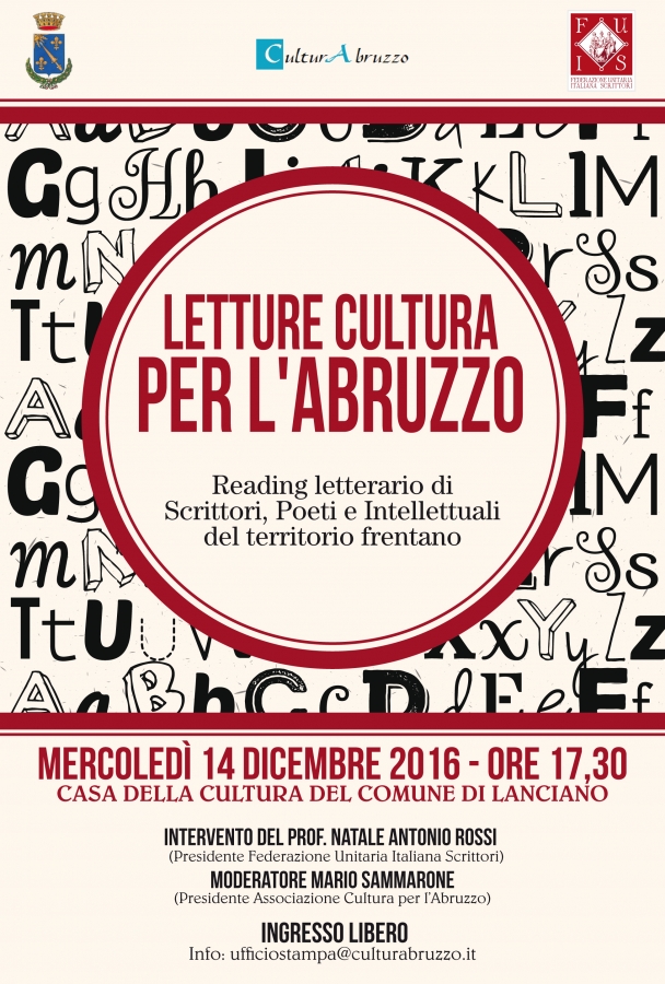 "Letture - Cultura per l'Abruzzo", con il patrocinio del Comune di Lanciano e della Federazione Unitaria Italiana Scrittori, sarà occasione di incontro per tutti quelli che si impegnano per la cultura e vedrà la partecipazioni di scrittori del territorio frentano (ma non solo).