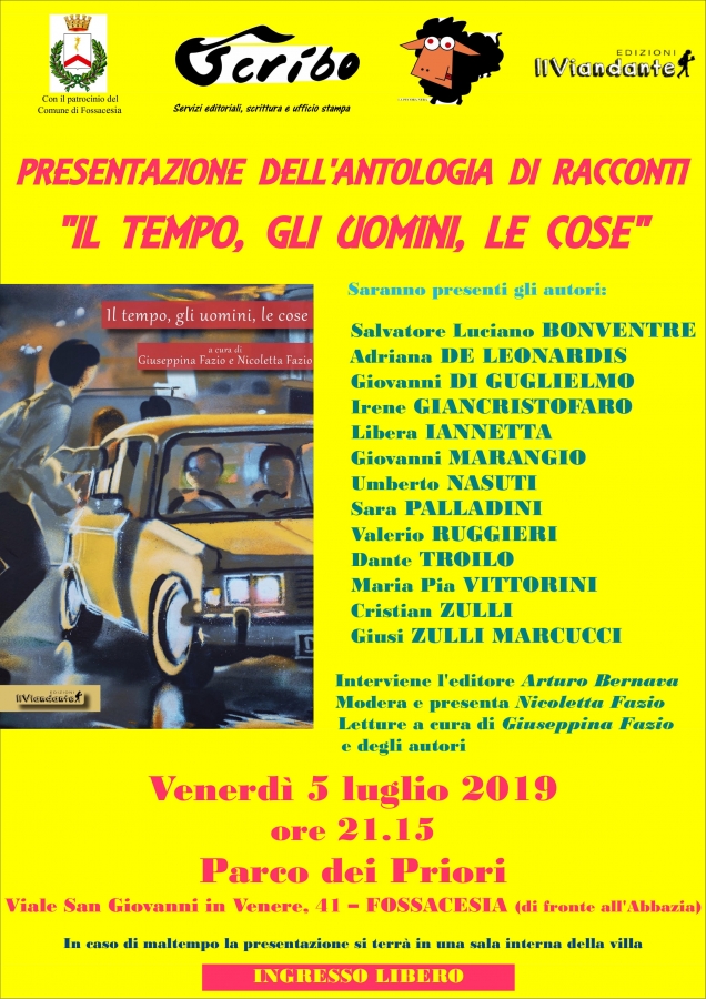 Nell'incantevole scenario del Parco dei Priori, di fronte all'abbazia di San Giovanni in Venere, a Fossacesia, domani, venerdì 5 luglio, alle 21.15, sarà presentatal'antologia di racconti "Il tempo, gli uomini, le cose", curata da Giuseppina Fazio e Nicoletta Fazio dell'agenzia Scribo e edita dalla casa editrice “IlViandante” di Chieti.