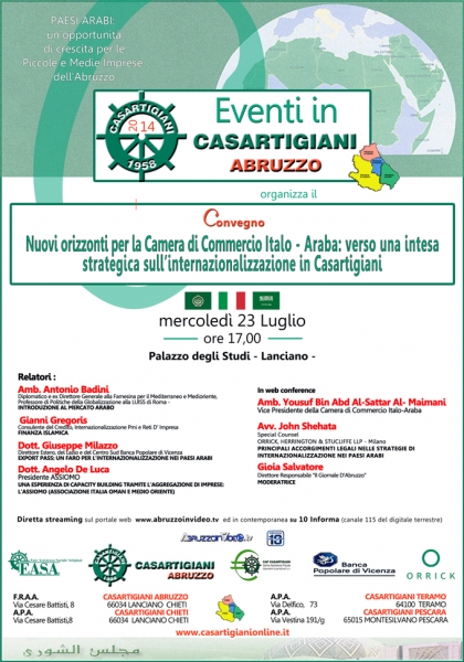 “Nuovi orizzonti per la Camera di Commercio italo-araba: verso una intesa strategica sull'internazionalizzazione in Casartigiani", è questo il titolo del convegno organizzato da Casartigiani il 23 luglio alle 17 presso il Palazzo degli Studi di Lanciano.