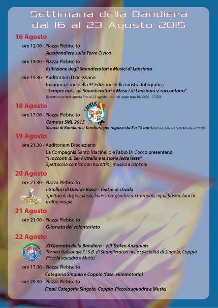 Il 22 agosto spazio alle esibizioni e alle gare per l'11esima Giornata della Bandiera e l'ottavo Trofeo Anxanum, il torneo nazionale di sbandieratori che si sfideranno nelle specialità Singolo, Coppia, Piccola squadra e Musici.