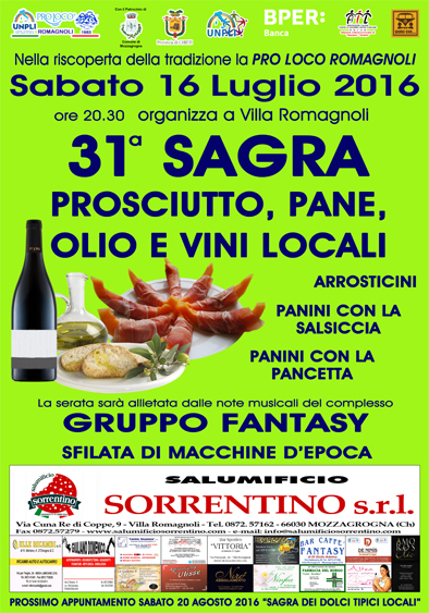 Sabato 23 luglio alle ore 20.30, nuova data dopo il rinvio a causa del maltempo, la serata organizzata dalla Pro Loco Romagnoli, tra enogastronomia e piatti locali anche l’intrattenimento musicale con il “Gruppo Fantasy” oltre alla simpatica sfilata di Auto d’epoca.