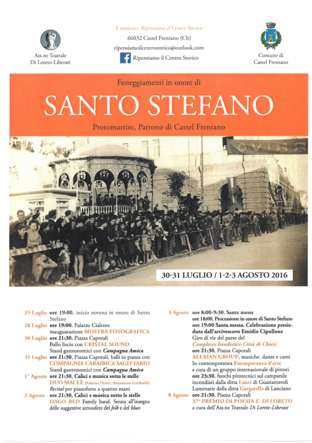 E' stato presentato ieri (in occasione della festa patronale in onore di Santo Stefano che si terrà il 3 agosto) dall’associazione “Ripensiamo il Centro Storico “ il calendario degli eventi estivi che caratterizzeranno questi mesi ed animeranno il centro storico del comune di Castel Frentano (Ch) , un paese che pian piano si sta facendo scoprire. S' incomincerà con la serata del 28 luglio alle ore 19:00 in piazza Caporali, presso l’ antico palazzo Cialente con la presentazione della mostra fotografica che rimarrà aperta fino al 30 agosto dal tema: “Castel Frentano si racconta”. Le foto, scelte da una commissione nominata ad hoc interesseranno un arco temporale dalla fine dell' ottocento fino ad arrivare ai nostri giorni. Il 30 e 31 luglio si potrà salire sul campanile parrocchiale che resterà aperto fino al tre agosto seguendo un preciso orario, mentre nel corso della serata ,invece, a partire dalle ore 21:30 vi sarà la possibilità di effettuare degustazioni e poter cenare presso gli stand di “campagna amica” , godendo della bellissima atmosfera dei palazzi illuminati con le torce e dei monumenti che resteranno aperti fino a tarda notte. Il 1 agosto alle ore 21:30 sarà possibile ascoltare in piazza Caporali il concerto pianistico del duo Maclè ed assaporare del buon vino sotto le stelle mentre il 2 agosto sempre dalle 23:30 ancora calici e musica sotto le stelle. Durante tutte le serate resteranno aperti al pubblico le chiese di Santo Stefano con il suo campanile, quella del Monte dei Morti e la cappella privata della scuola materna A.R. Caporali in via della Rosa con i suoi giardini pensili. Inoltre in loco vi saranno presenti delle guide che avranno lo scopo di guidare appunto i turisti e di fornire alcune delucidazioni storiche sui luoghi.