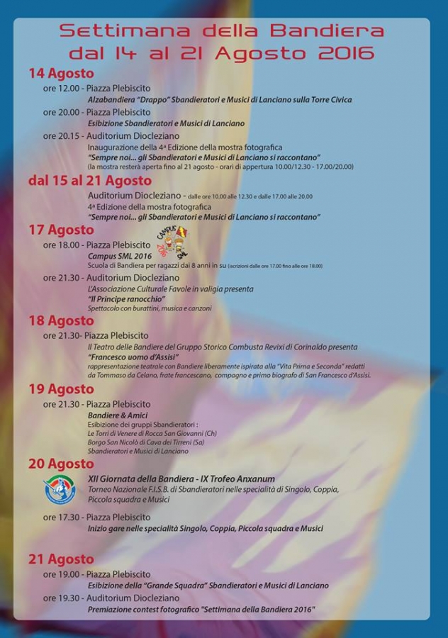 Il 19 agosto, la serata con gli amici di Rocca San Giovanni, il gruppo Le Torri di Venere, e con Gli Sbandieratori Borgo San Nicolò di Cava dei Tirreni nello spettacolo in Piazza Plebiscito, prima del tradizionale Trofeo Anxanum del 20 agosto, giunto alla nona edizione, e che vede la partecipazione di gruppi di sbandieratori provenienti da tutta l’Italia per contendersi i premi nelle diverse specialità.