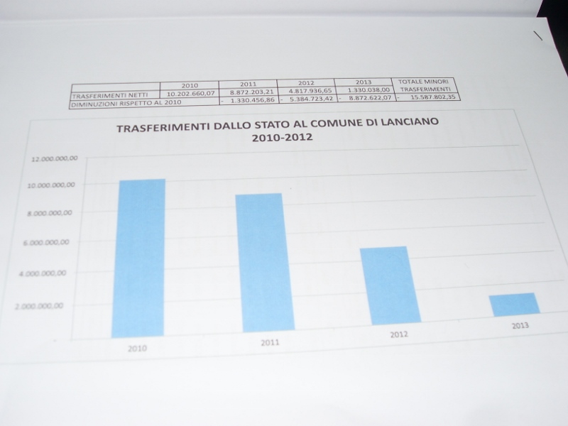 Annata nera.Il sindaco di Lanciano non ha usato mezzi termini quando ha parlato di grave ferita inflitta ai comuni. 16 milioni di euro in meno il patto di stabilità fa tremare tutti, sottolinea Pupillo, ma il sociale non si tocca.Una previsione di bilancio quella dell'anno 2013 davvero difficile sulla quale, i presenti fra tutti l'assessore Valentino Di Campli invitano a non farne strumentalizzazioni politiche riferendosi alle accuse che nelle settimane scorse la minoranza in consiglio comunale ha fatto alle politiche economiche del comune. "Abbiamo deciso di rimanere con la Tarsu e non passare alla Tares che avrebbe significato aumenti del 517% per alcune categorie". Una bella notizia insomma che tuttavia non dinimuisce le tasse che i cittadini devono rimettere al comune che suo malgardo è costretto a far pagare perchè si tratta di una imposizione voluta dalla Stato. I comuni vittime che a loro volta non possono assumere personale che a sua volta garantirebbe servizi ai cittadini, tasse sui rifiuti che aumentano perchè si è costretti ad utilizzate la discarica di Chieti perchè quella di Cerratina è chiusa con i prezzi di smaltimento decisi da un privato e la Regione sembra non poter nulla, progetti che rischiano di non poter essere attuati, aumenti che il comune non vorrebbe in nessuna maniera applicare ma che purtroppo si vede costretto a fare. Tuttavia, il sociale non si è toccato, la rotonda di via per Fossacesia si farà entro pochi mesi. Il bilancio completo che comunque subirà modifiche entro dicembre, approvato il 12 ottobre è di 50. 447,197 milioni di euro. Tutti i documenti sono consultabili sull'Albo Pretorio del comune di Lanciano