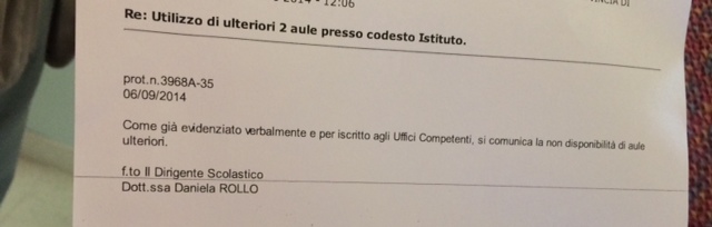 "Quando ho chiamato la collega del Fermi - afferma Mariotti - mi è stato detto che c'era stato un errore dalla provincia e che le due aule in questione, in realtà , non sono libere". A questa è seguita un'ufficiale comunicazione scritta dal dirigente scolastico della scuola per ragionieri e geometri Rollo, in cui "si comunica la non disponibilità delle due aule".