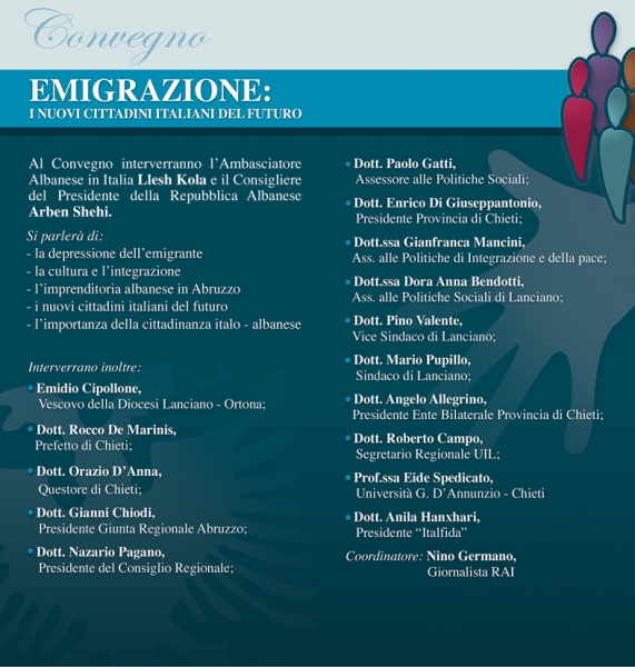Il convegno vuole raccontare la storia del popolo albanese, le sue glorie e i suoi drammi affrontando il tema tragico e attuale dell’emigrazione. Si parlerà di cultura dell’integrazione, della depressione dell’emigrante, ma anche delle sfide dell’imprenditoria albanese in Italia e in Abruzzo e dell’importanza di questa nuova cittadinanza italo-albanese fatta di persone che, costrette ad emigrare dal loro paese tentano di ricostruirsi, tra mille difficoltà, una coscienza nazionale diventando molto spesso esempi di orgoglio, sia per il paese di origine che per quello che li ha adottati, l’Italia.