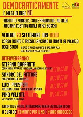 Un modo per coinvolgere i cittadini e avanzare le ragioni che hanno condotto alla scelta del No di alcuni esponenti delle istituzioni e delle associazioni, interverranno infatti Stefano Quaranta, Deputato di Sinistra Italiana e membro della Commissione Affari Costituzionali, Sandro Del Fattore, Segretario CGIL Abruzzo-Molise, il Presidente A.N.P.I. Pescara Luca Prosperi, e Pino Valente, vice Sindaco di Lanciano.