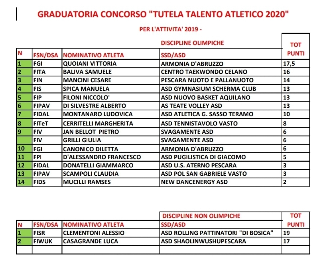 La premiazione ha preso in oggetto la stagione sportiva 2019, di 16 atleti così suddivisi: 14 premi per atleti che hanno conseguito risultati nelle discipline olimpiche; 2 premi per atleti di discipline non olimpiche. Assegnati premi sulla base di segnalazioni delle società, a atleti residenti in Abruzzo tesserati per società sportive affiliate in Regione, iscritte al registro nazionale delle associazioni e società sportive dilettantistiche del Coni. L’entità del premio: 2500 euro, 60% agli atleti e 40% alle società di appartenenza con l’impegno ad utilizzarli per la valorizzazione tecnica degli atleti stessi.