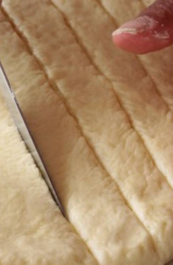 A questo punto, praticare con un coltello affilato, delle incisioni lungo tutta la superficie dell'impasto, andando a formare dei rombi.