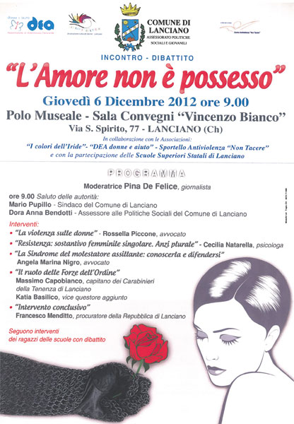 e con la partecipazione delle scuole superiori statali di Lanciano, comunica alle SV che giovedì 06 dicembre alle ore 9.00 presso il Polo museale di Lanciano, si svolgerà l’Incontro - Dibattito “L’Amore non è possesso”.