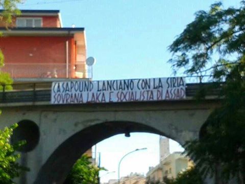 Lanciano, 14 giugno - “CasaPound Lanciano con la Siria sovrana, laica e socialista di Assad”. È quanto si legge sullo striscione affisso nella notte da CasaPound Italia per esprimere solidarietà al legittimo governo siriano.