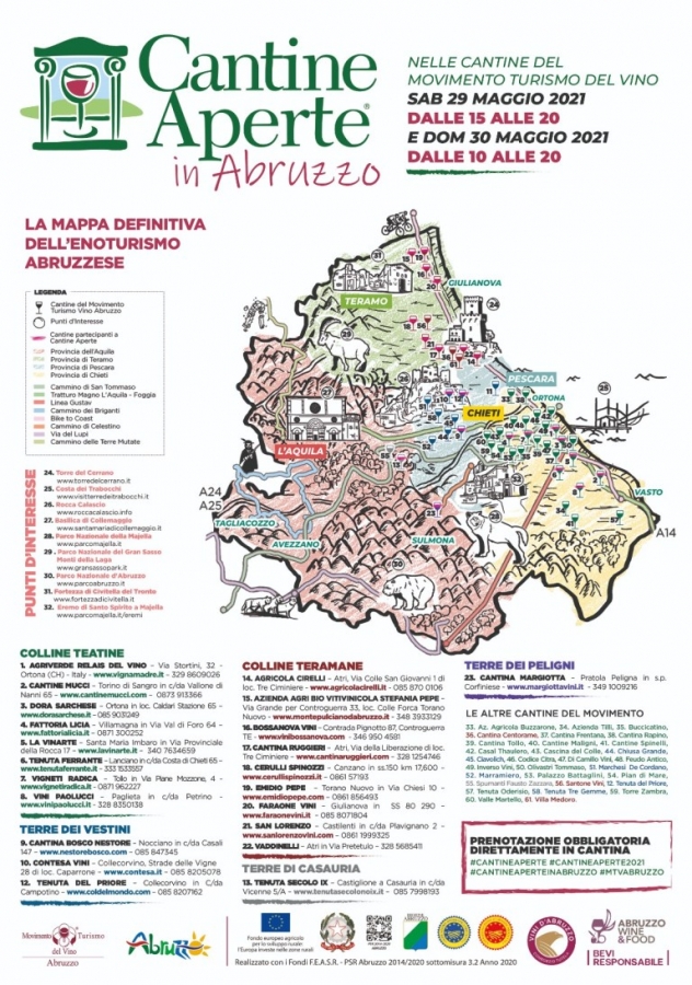 Sabato 29 e domenica 30 maggio tornano finalmente le Cantine Aperte in Abruzzo e in tutta Italia, grazie al Movimento Turismo del Vino, la storica associazione di cantine italiane che da oltre trent’anni è protagonista nella promozione enoturistica dei territori e della crescita della cultura dell’accoglienza in cantina.