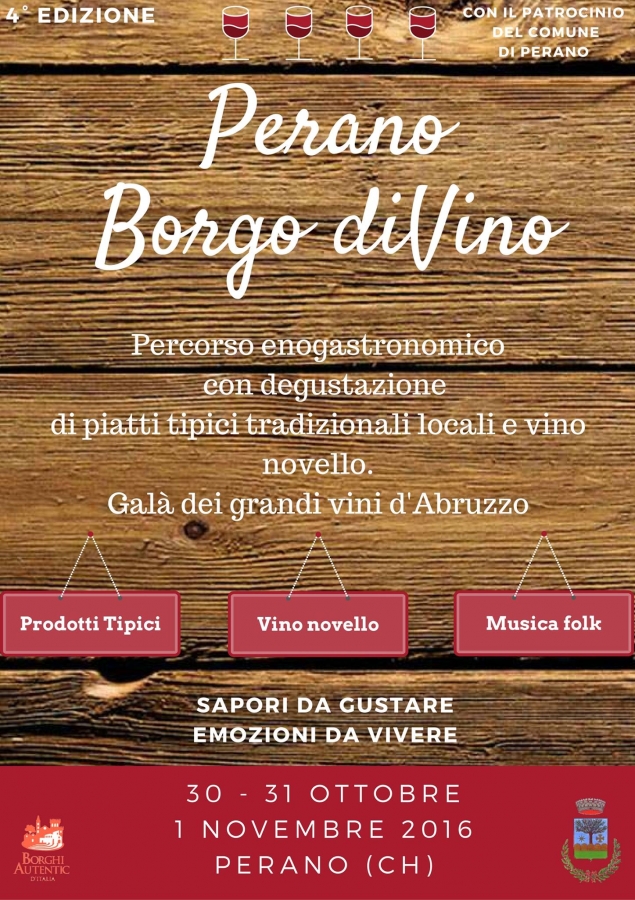 PERANO - Perano si prepara alla quarta edizione di “Perano Borgo diVino”, tre giorni all’insegna del buon cibo, vino, tradizioni e divertimento. Il 30 e 31 ottobre e il 1 novembre il suggestivo borgo del Sangro accoglierà dalle 18 in poi i curiosi visitatori amanti dei gusti tradizionali, quelli di una volta.
