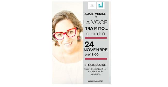 Oggi pomeriggio alle ore 18.00 a Lanciano presso la sede dell'associazione Quartiere storico Civitanova in via dei Funai, la cantante e insegnante di canto Alice Vedilei terrà il concerto “La voce tra mito e realtà”.
