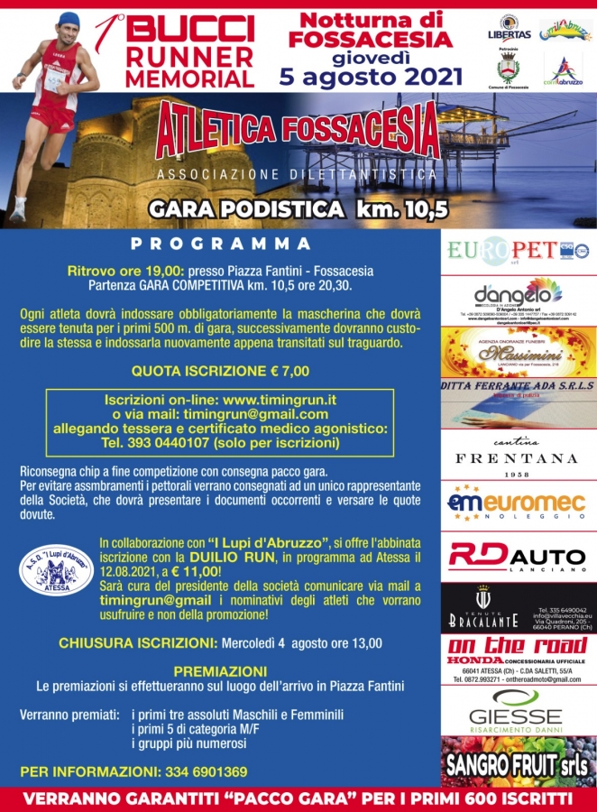 L’evento Bucci Runner Memorial-Notturna di Fossacesia, in programma la sera di giovedì 5 agosto, rappresenta il giusto connubio tra il ricordo e la passione per il podismo cui il compianto Antonio Bucci era conosciuto agli onori delle cronache.