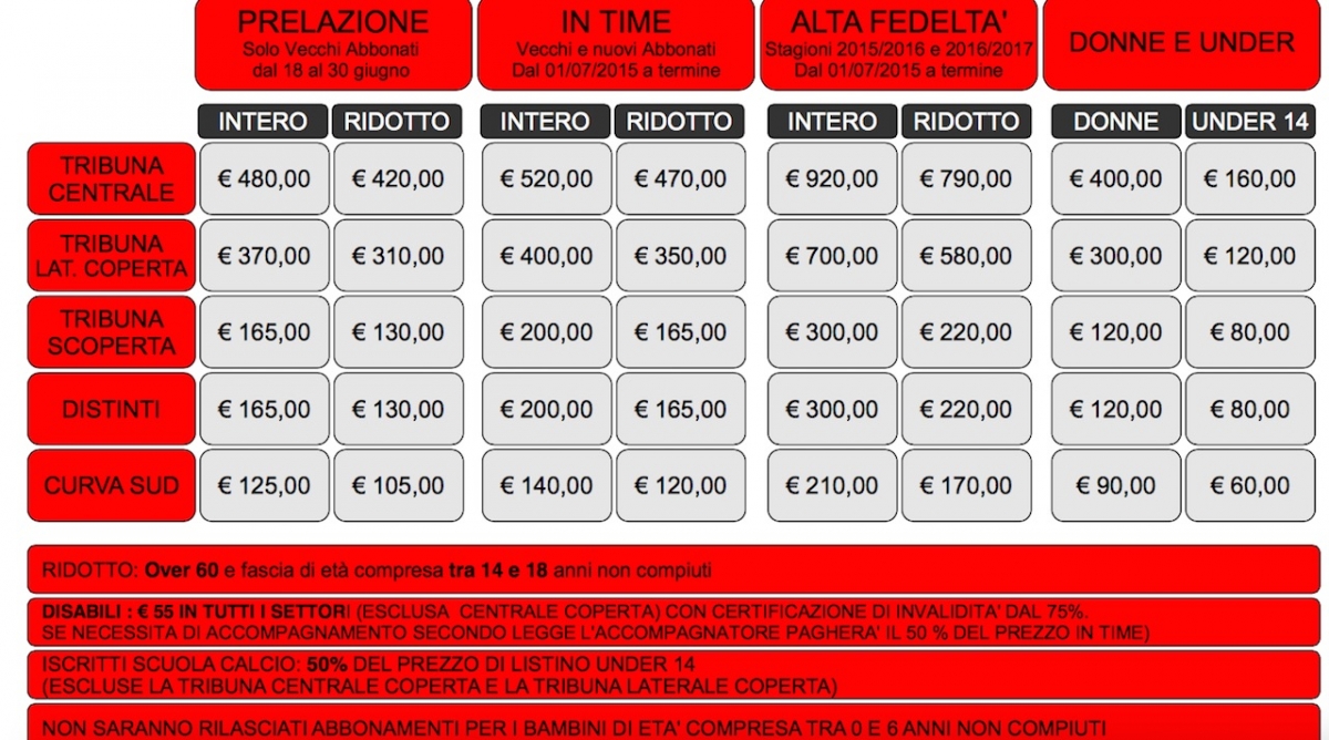 Di seguito, tutti i costi per i diversi settori dello stadio Guido Biondi (tribunale centrale, laterale coperta, scoperta, distinti e curva sud):