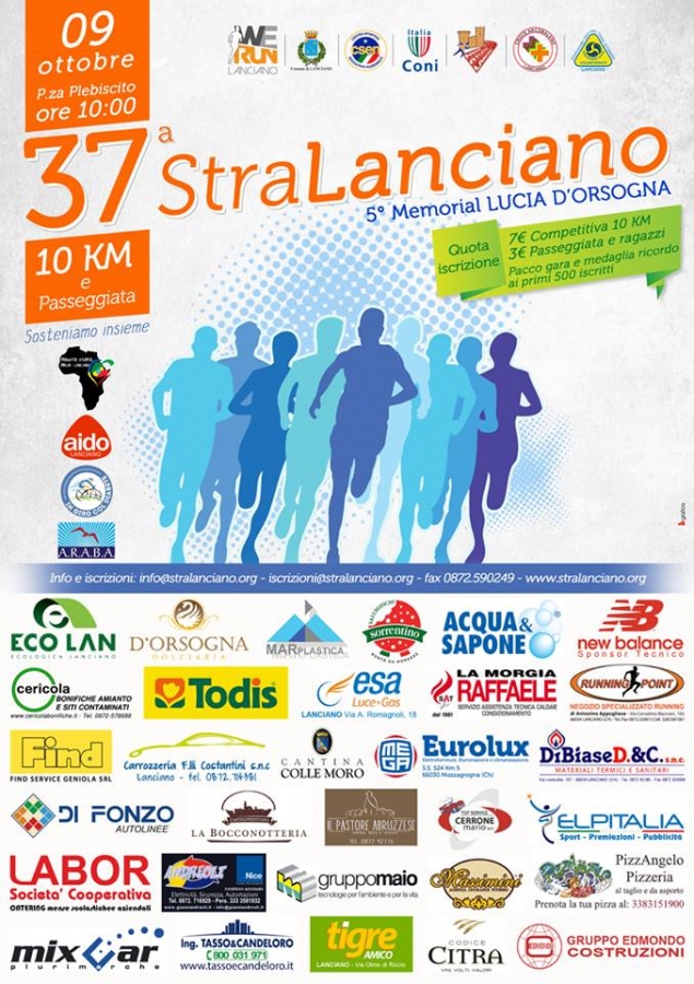Domenica 9 ottobre la 37° edizione della StraLanciano organizzata dall’Asd We Run Lanciano per gli atleti che parteciperanno alla gara competitiva ma anche per gli appassionati di sport che vorranno prendere parte alla passeggiata.