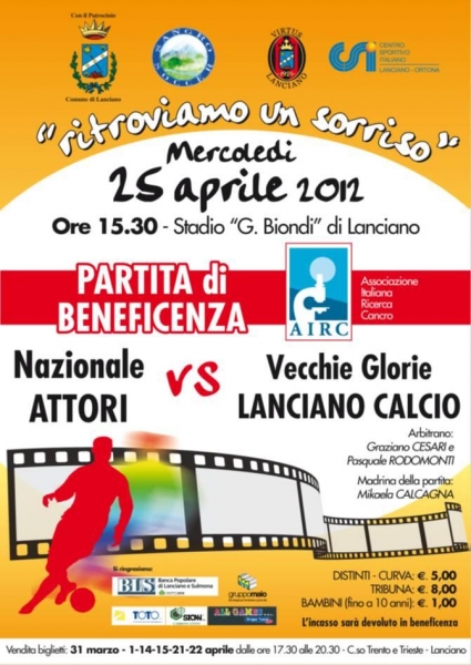 Si tratta di una partita di calcio tra la Nazionale Attori e una selezione di Vecchie Glorie del Lanciano Calcio, il cui ricavato andrà completamente devoluto a favore dell’AIRC, Associazione Italia Ricerca Cancro. Madrina della partita sarà Mikaela Calcagna.