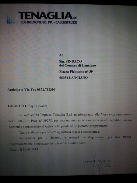 "In seguito a contatti avviati con la ditta Tenaglia, con il dovuto anticipo sui tempi utili al prelievo dei fusti di acacia, all’amministrazione di Lanciano non risultava in alcun modo - scrive Pupillo - che il Comune di S.Vito avesse, come invece sostiene, già individuato le aree ove reperire le piante di acacia e che queste fossero sufficienti per la ricostruzione della struttuta. Né risultava che l’Amministrazione di S.Vito si fosse posta il problema prima del 13 agosto quando il sindaco Catenaro non ravvisava alcun motivo per ritenere “inutili” le acacie lancianesi. In effetti con una telefonata di mercoledì 13 pomeriggio ho chiesto al sindaco di San Vito se potevo annunciare questa nostra volontà, frutto di esclusivo interesse culturale e artistico. Ho ricevuto il suo assenso e ho proceduto a comunicare alla stampa e alla ditta la nostra volontà il giorno successivo giovedì 14 agosto. In caso contrario mi sarei tirato indietro. Questa è la verità sul fatto anche se qualcuno esprime, artatamente, valutazioni contrarie, che rinvio al mittente, che mettono in dubbio la chiarezza del comune di Lanciano. Il qualità di Sindaco auspico per il futuro che i diversi municipi sappiano dimostrare il possesso di una maggiore dose di spirito di coesione territoriale, che nelle attuali difficoltà è non solo indice di maturità politica ma dovere verso i propri concittadini. Ovviamente, il Comune di Lanciano augura all’amministrazione di S.Vito che gli esperti giudichino utili le materie prime individuate con obiettivo ritardo e resta a disposizione qualora ciò non sia."