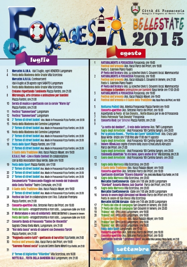 Iniziato con un appuntamento dedicato ai bambini sull’importanza del rispetto dell’ambiente, il programma proseguirà con il secondo torneo di Street Basket, la Festa dello sport, la Festa del Gusto, la presentazione di un nuovo e suggestivo video sui trabocchi “Traboccando – Viaggio nel mondo dei trabocchi della Costa teatina”, la Notte Blu, Naturalmente a Fossacesia, la Notte Bianca, il Festival dell’Armonia, il Gusto della Tradizione, gli spettacoli teatrali “Stasera Edoardo” “Noi della bassa” ed “I Promessi Sposi”, i Concerti Aperitivo di musica da camera e concerti di musica jazz al Parco dei Priori, Venere Wine e Jazz, Trabocc not.