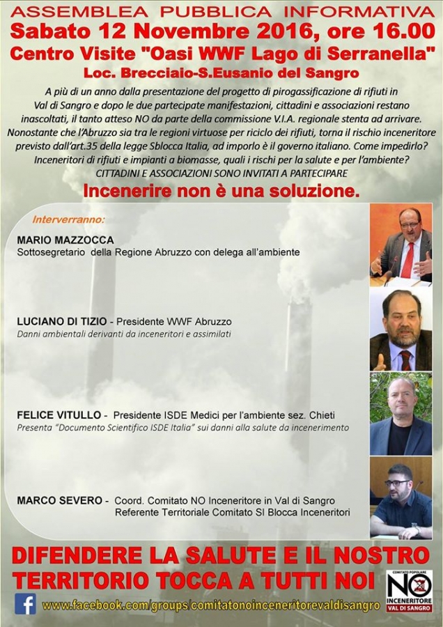 Saranno presenti durante l’assemblea insieme al Coordinatore del Comitato No Inceneritore in Val Di Sangro Marco Severo, il Sottosegretario della Regione Abruzzo con delega all’Ambiente Mario Mazzocca, Luciano Di Tizio presidente WWF Abruzzo e Felice Vitullo Presidente Isde Medici per l’Ambiente della Sezione di Chieti, che presenterà un documento scientifico sui danni alla salute da incenerimento.