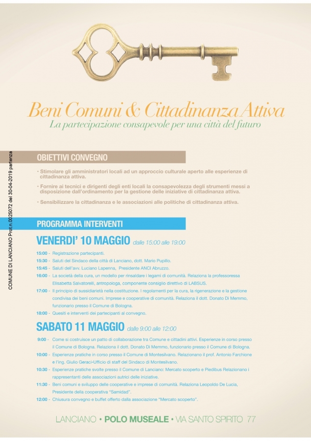 Nel pomeriggio di venerdì 10 maggio e la mattina di sabato 11, si terrà al Polo Museale di Lanciano il convegno "Beni Comuni & Cittadinanza Attiva - La partecipazione consapevole per una città del futuro".
