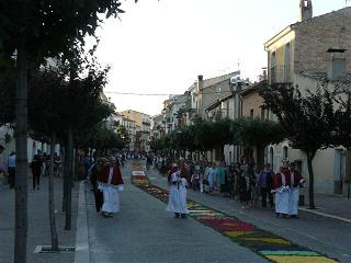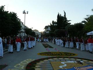 A sera su quel lungo tappeto si snoda la processione del Sacramento, che partirà da Santa Maria maggiore alle 18,30 accompagnata dall’Arciconfraternita San Francesco d’Assisi e da due ali di folla. Per abbellire il percorso e rendere più solenne il passaggio dell’Ostia santa, a balconi e finestre vengono stesi coperte e drappi preziosi, si lanciano fiori e si accendono bracieri di incenso.