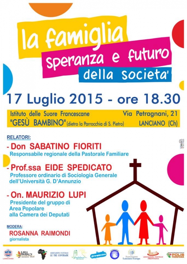 LANCIANO - La famiglia, speranza e futuro della società è l’oggetto dell’incontro che si terrà il prossimo venerdì 17 luglio, alle ore 18.30, presso l’istituto Gesù Bambino, in via Petragnani 21, vicino la parrocchia di San Pietro.