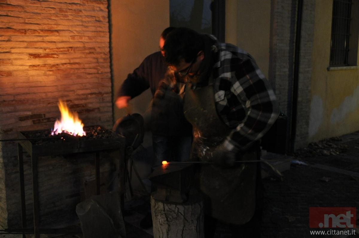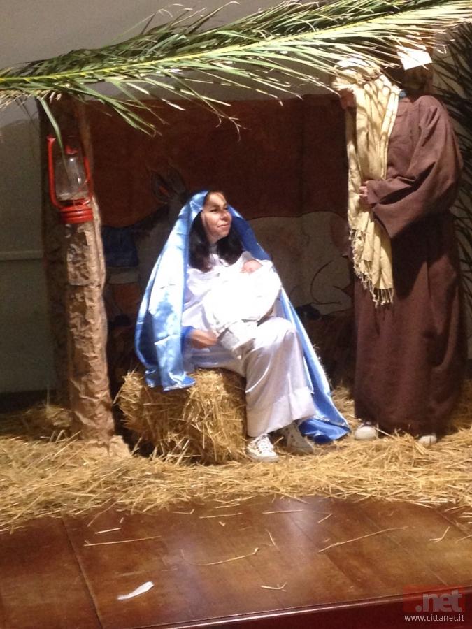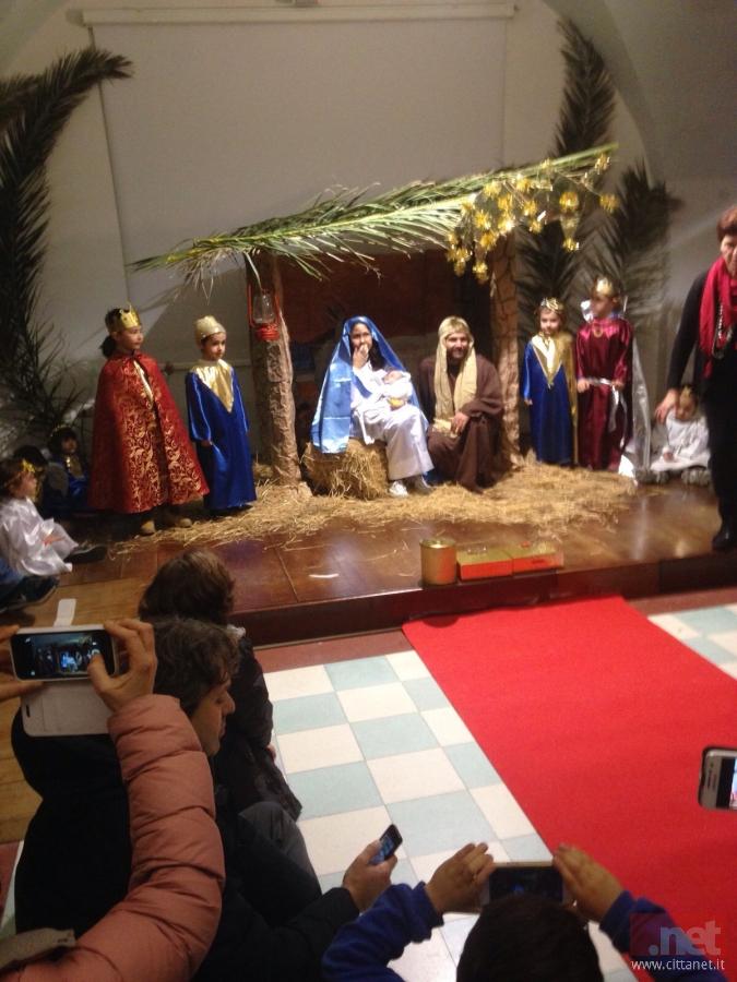 E dopo la rappresentazione delle botteghe artigianali si è passati all’aspetto più religioso del presepe, con i bimbi di 3 anni che, vestiti da angioletti, hanno fatto strada alla Madonna, San Giuseppe e a Gesù Bambino, rappresentati da una coppia di neogenitori che portava in braccio il loro piccolo Andrea di appena un mese.