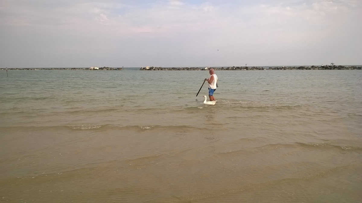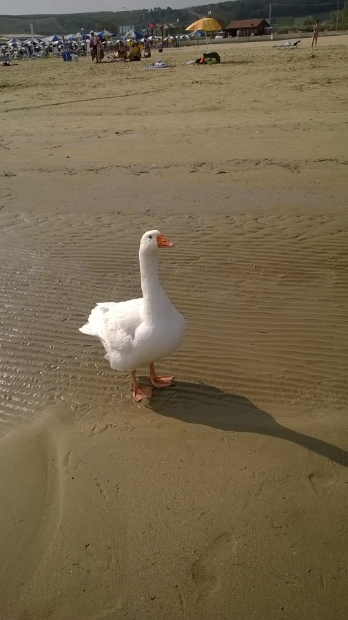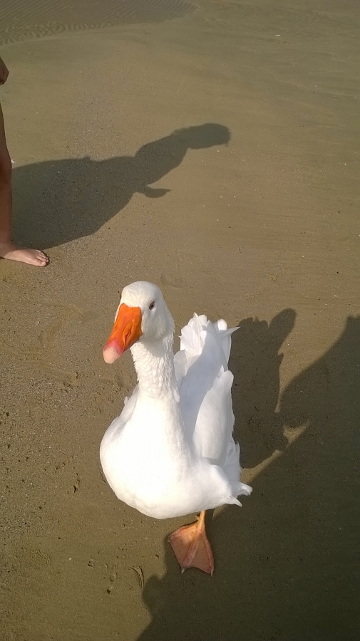 Ecco a cosa ho pensato questa mattina quando, sul lungomare del Lido le Morge di Torino di Sangro, immersa in mille pensieri e già proiettata verso gli impegni incombenti che l’arrivo di settembre porta con sé, mi sono accorta di una simpatica presenza, evidentemente passata inosservata ai più: un arzillo signore dalla faccia simpatica, ma che per pudore non conosco il nome, portava a passeggio una papera, si proprio un bel “paparone” dall’inconfondibile piumaggio bianco e becco arancio.