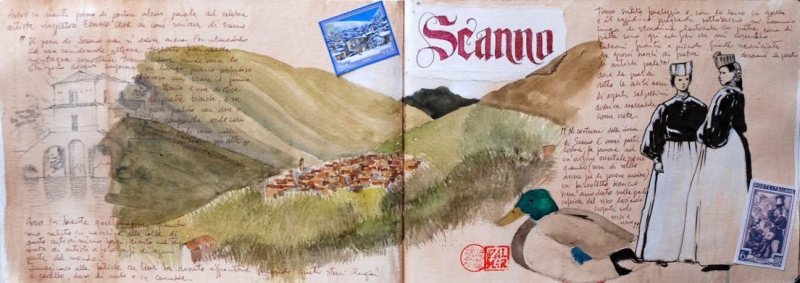 […] Il paese di Scanno non si vedeva ancora. Per intravederlo ad una considerevole altezza, tagliato fuori dalle montagne circostanti tranne dove nude rocce lo stringono, dovevo superare un largo piano paludoso, attraverso cui scorre il fiume Sagittario, e una distesa di pietre bianche; è un paese pulito con due o tre Campanili e le case principali sono nelle posizioni più alte".
